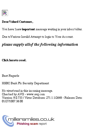 • Email asks you to confirm/update/verify your account data at HSBC BANK PLC by visiting the given link. You will be taken to a spoof website where your details will be captured for the phishers.