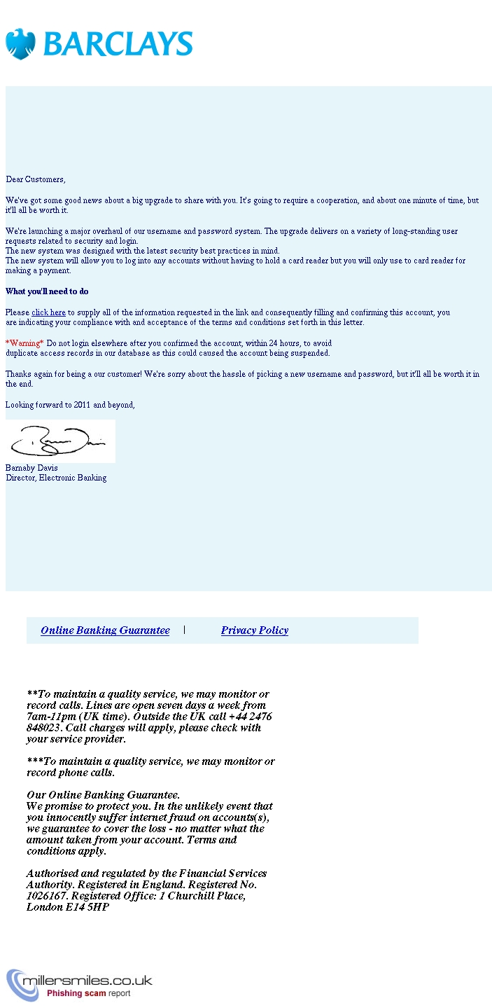 - Email asks you to confirm/update/verify your account data at Barclays by visiting the given link. You will be taken to a spoof website where your details will be captured for the phishers.