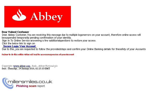 • Email asks you to confirm/update/verify your account data at Abbey National Plc by visiting the given link. You will be taken to a spoof website where your details will be captured for the phishers.