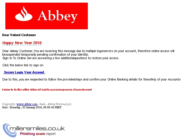 • Email asks you to confirm/update/verify your account data at Abbey Santander by visiting the given link. You will be taken to a spoof website where your details will be captured for the phishers.