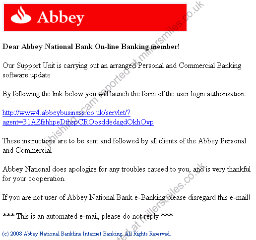 • Email asks you to confirm/update/verify your account data at Abbey by visiting the given link. You will be taken to a spoof website where your details will be captured for the phishers.