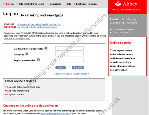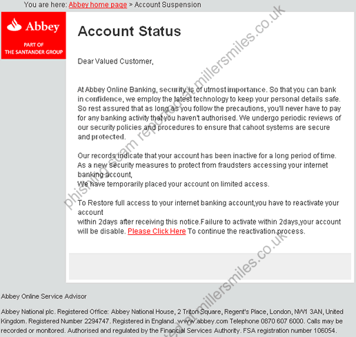 • Email asks you to confirm/update/verify your account data at Abbey by visiting the given link. You will be taken to a spoof website where your details will be captured for the phishers.
