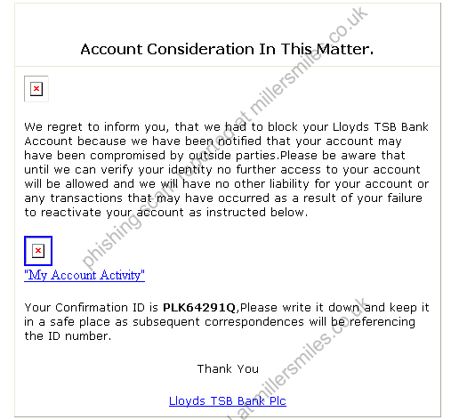 • Email asks you to confirm/update/verify your account data at Lloyds TSB Bank by visiting the given link. You will be taken to a spoof website where your details will be captured for the phishers.