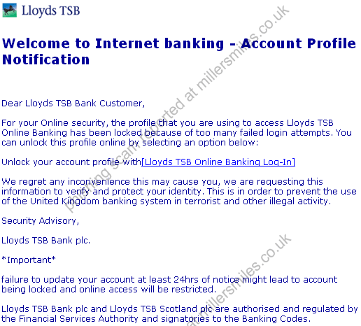 • Lloyds TSB Bank never send their users emails requesting personal details in this way.