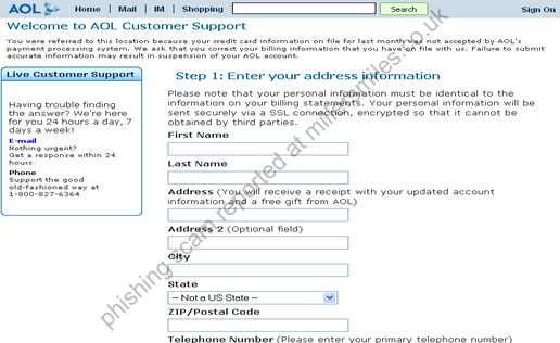• Email asks you to confirm/update/verify your account data at AOL by visiting the given link. You will be taken to a spoof website where your details will be captured for the phishers.