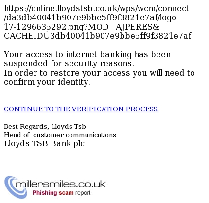 • Email asks you to confirm/update/verify your account data at - Lloyds by visiting the given link. You will be taken to a spoof website where your details will be captured for the phishers.
