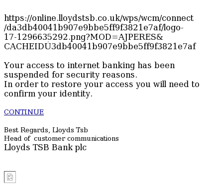 • Email asks you to confirm/update/verify your account data at LloydsBank by visiting the given link. You will be taken to a spoof website where your details will be captured for the phishers.
