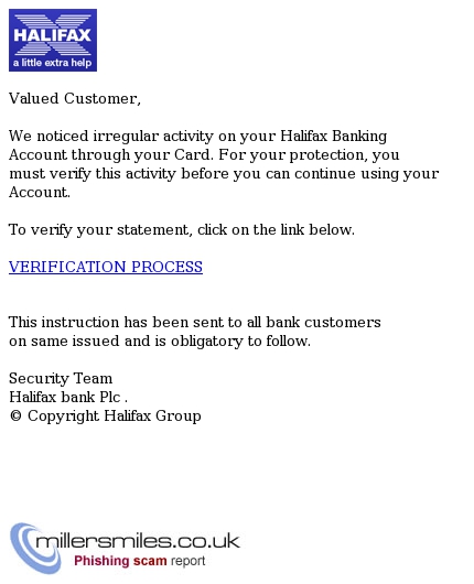 • OnlineHelpdesk@Halifax.co.uk never send their users emails requesting personal details in this way.