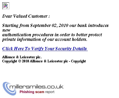 • Email asks you to confirm/update/verify your account data at Alliance & Leicester Bank by visiting the given link. You will be taken to a spoof website where your details will be captured for the phishers.