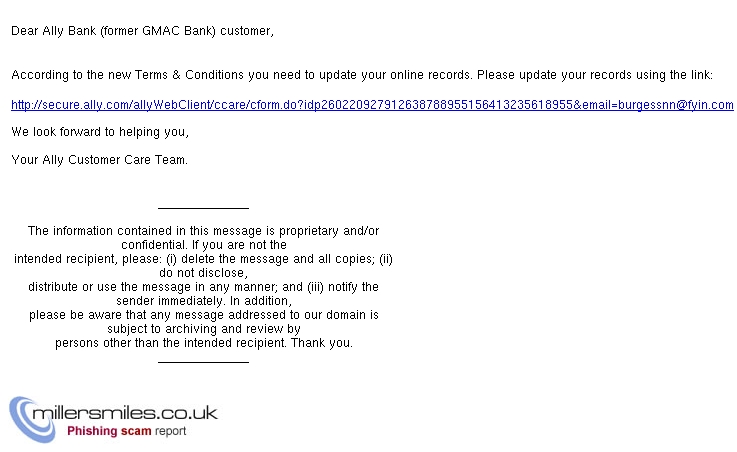 • Email asks you to confirm/update/verify your account data at CustomerCare@ally.com by visiting the given link. You will be taken to a spoof website where your details will be captured for the phishers.