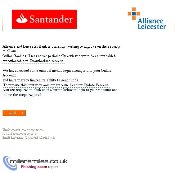 • Alliance and Leicester never send their users emails requesting personal details in this way.