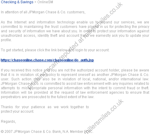 • Email asks you to confirm/update/verify your account data at JPMorgan Chase & Co. by visiting the given link. You will be taken to a spoof website where your details will be captured for the phishers.