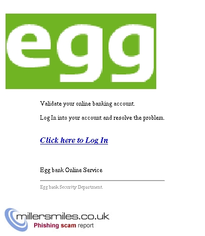 • Email asks you to confirm/update/verify your account data at Egg by visiting the given link. You will be taken to a spoof website where your details will be captured for the phishers.