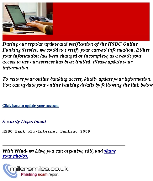 • Email asks you to confirm/update/verify your account data at HSBC by visiting the given link. You will be taken to a spoof website where your details will be captured for the phishers.