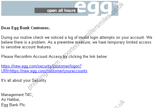 • Email asks you to confirm/update/verify your account data at Egg Bank by visiting the given link. You will be taken to a spoof website where your details will be captured for the phishers.