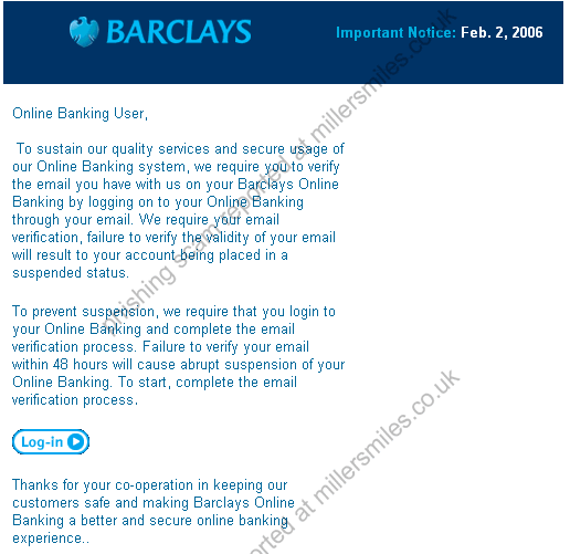• Email asks you to confirm/update/verify your account data at Barclays by visiting the given link. You will be taken to a spoof website where your details will be captured for the phishers.