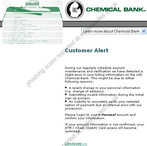 • Email asks you to confirm/update/verify your account data at Chemical Bank by visiting the given link. You will be taken to a spoof website where your details will be captured for the phishers.