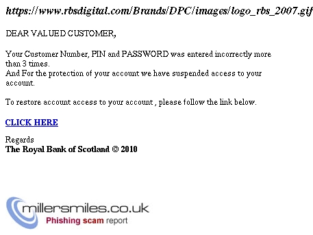 - Email asks you to confirm/update/verify your account data at RBS | The Royal Bank of Scotland by visiting the given link. You will be taken to a spoof website where your details will be captured for the phishers.