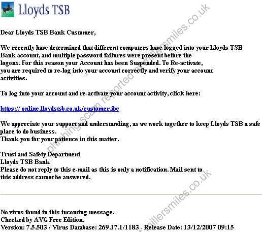 • Email asks you to confirm/update/verify your account data at LloydsTSB Bank by visiting the given link. You will be taken to a spoof website where your details will be captured for the phishers.
