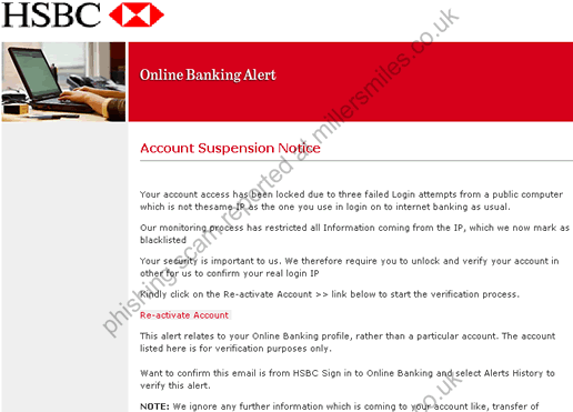 • Email asks you to confirm/update/verify your account data at HSBC Bank by visiting the given link. You will be taken to a spoof website where your details will be captured for the phishers.