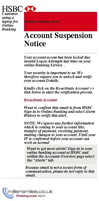• Email asks you to confirm/update/verify your account data at HSBC Bank Plc by visiting the given link. You will be taken to a spoof website where your details will be captured for the phishers.