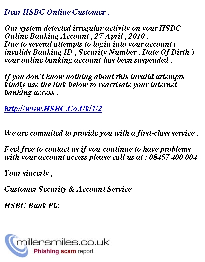 OUR SYSTEM DETECTED IRREGULAR ACTIVITY ON YOUR HSBC ONLINE BANKING ACCOUNT , 27 APRIL , 2010 . Due to several attempts to login into your account ( invalids Banking ID , Security Number , Date Of Birth ) your online banking account has been suspended .