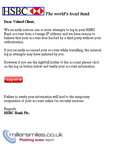 We recently notices one or more attempts to log in your HSBC Bank account from a foreign IP address and we have reason to believe that your account was hacked by a third party without your authorization.