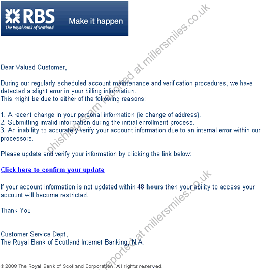 • Email asks you to confirm/update/verify your account data at RBS by visiting the given link. You will be taken to a spoof website where your details will be captured for the phishers.
