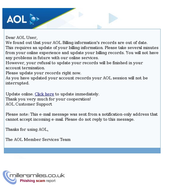 • Email asks you to confirm/update/verify your account data at AOLAccount by visiting the given link. You will be taken to a spoof website where your details will be captured for the phishers.