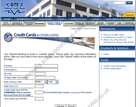 • Email asks you to confirm/update/verify your account data at GTE Federal Credit Union by visiting the given link. You will be taken to a spoof website where your details will be captured for the phishers.
