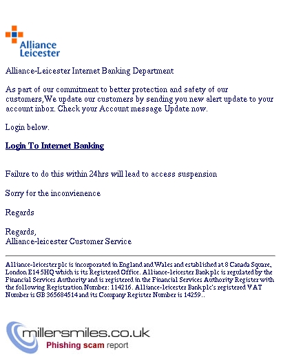 • Email asks you to confirm/update/verify your account data at Alliance & Leicester by visiting the given link. You will be taken to a spoof website where your details will be captured for the phishers.