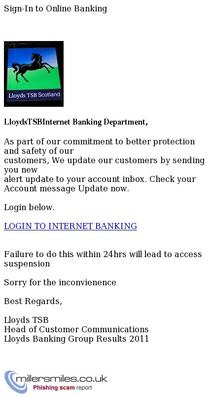 - Email asks you to confirm/update/verify your account data at Lloyds TSB by visiting the given link. You will be taken to a spoof website where your details will be captured for the phishers.