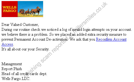 Email asks you to confirm/update/verify your account data at Wells Fargo by visiting the given link. You will be taken to a spoof website where your details will be captured for the phishers.