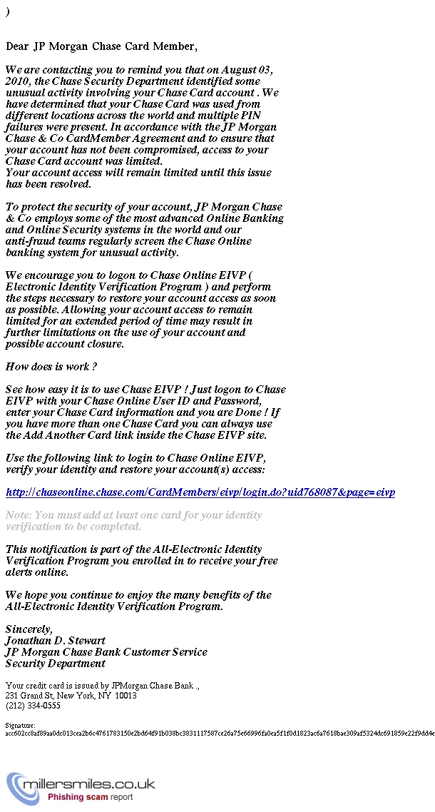 • Email asks you to confirm/update/verify your account data at JP Morgan Chase by visiting the given link. You will be taken to a spoof website where your details will be captured for the phishers.