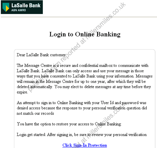 Email asks you to confirm/update/verify your account data at LaSalle Bank by visiting the given link. You will be taken to a spoof website where your details will be captured for the phishers.