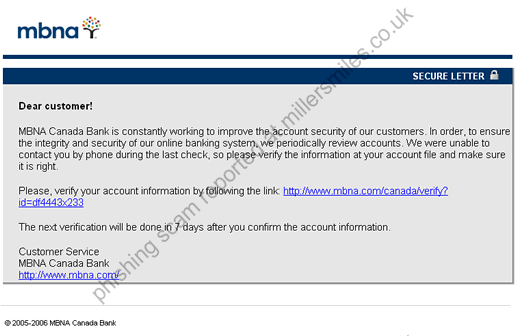 • Email asks you to confirm/update/verify your account data at MBNA Bank by visiting the given link. You will be taken to a spoof website where your details will be captured for the phishers.
