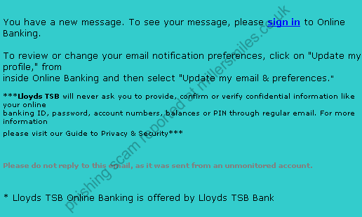 • Email asks you to confirm/update/verify your account data at Lloyds TSB by visiting the given link. You will be taken to a spoof website where your details will be captured for the phishers.