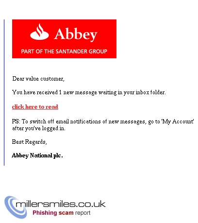 • Email asks you to confirm/update/verify your account data at Abbey National Plc. by visiting the given link. You will be taken to a spoof website where your details will be captured for the phishers.