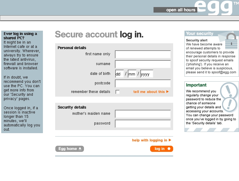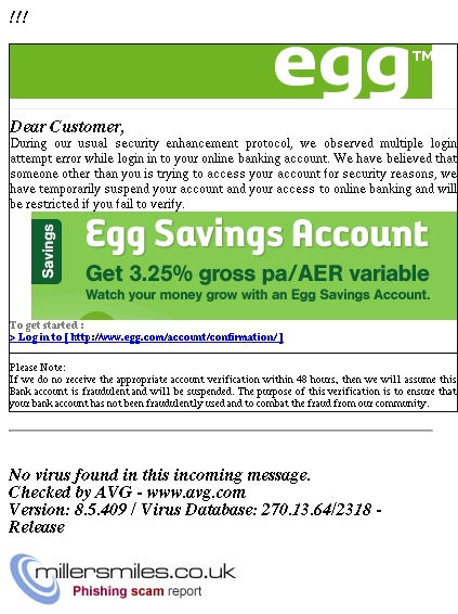 • Email asks you to confirm/update/verify your account data at Egg Security Alert by visiting the given link. You will be taken to a spoof website where your details will be captured for the phishers.