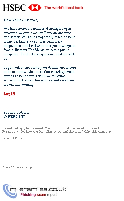 We have noticed a number of multiple log In attempts on your account. For your security and safety, We have temporarily disabled your online banking access. This temporary suspension could either be that you are login in from a different IP address or from a public computer . To lift the suspension, confirm with us .