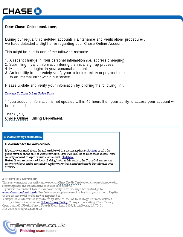 • Email asks you to confirm/update/verify your account data at Chase Card Services by visiting the given link. You will be taken to a spoof website where your details will be captured for the phishers.