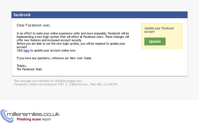 • Email asks you to confirm/update/verify your account data at Facebook by visiting the given link. You will be taken to a spoof website where your details will be captured for the phishers.