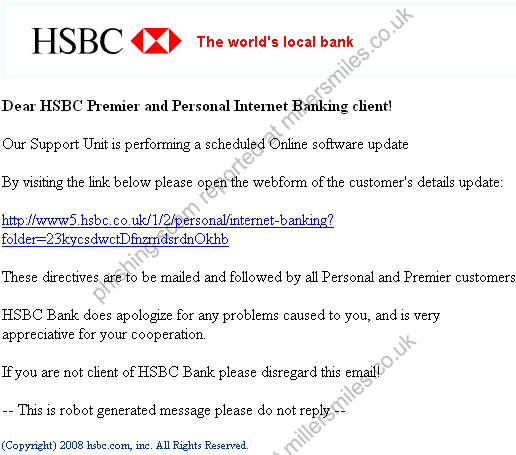 • Email asks you to confirm/update/verify your account data at HSBC Bank by visiting the given link. You will be taken to a spoof website where your details will be captured for the phishers.
