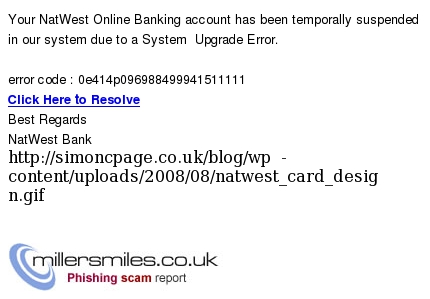 • Email asks you to confirm/update/verify your account data at NatWest. by visiting the given link. You will be taken to a spoof website where your details will be captured for the phishers.