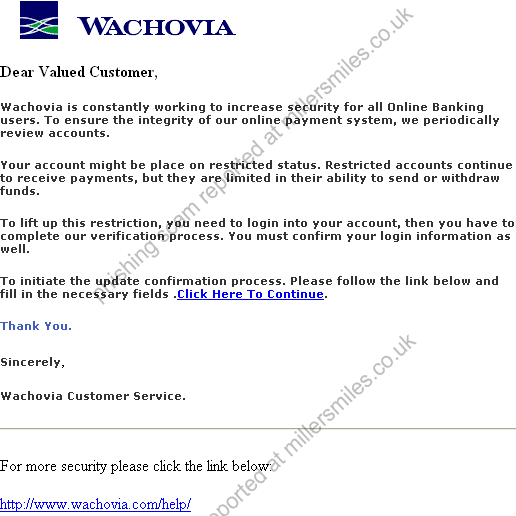 • Email asks you to confirm/update/verify your account data at Wachovia by visiting the given link. You will be taken to a spoof website where your details will be captured for the phishers.