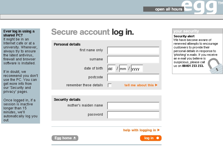• Email asks you to confirm/update/verify your account data at Egg Online by visiting the given link. You will be taken to a spoof website where your details will be captured for the phishers.