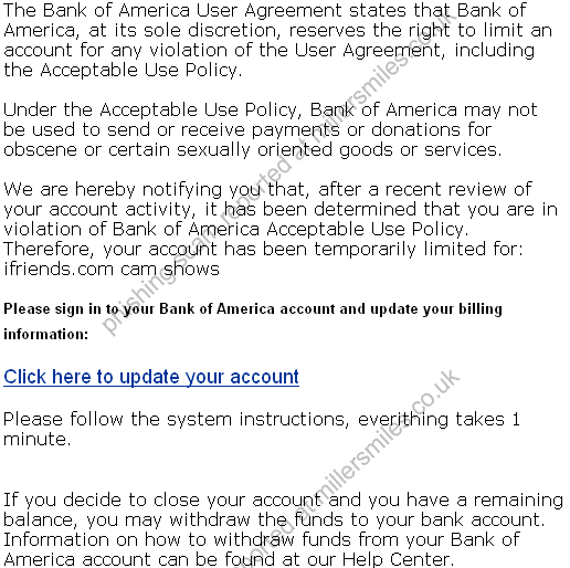 • Email asks you to confirm/update/verify your account data at Bank of America by visiting the given link. You will be taken to a spoof website where your details will be captured for the phishers.