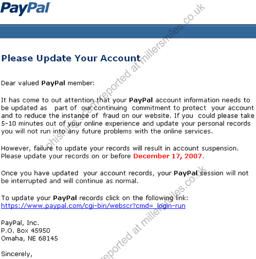 • Email asks you to confirm/update/verify your account data at PayPal by visiting the given link. You will be taken to a spoof website where your details will be captured for the phishers.
