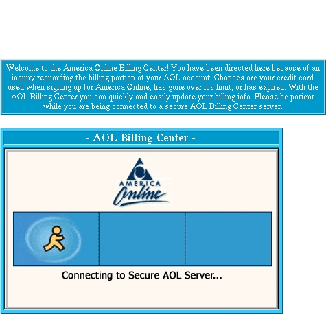 • Email asks you to confirm/update/verify your account data at AOL by visiting the given link. You will be taken to a spoof website where your details will be captured for the phishers.