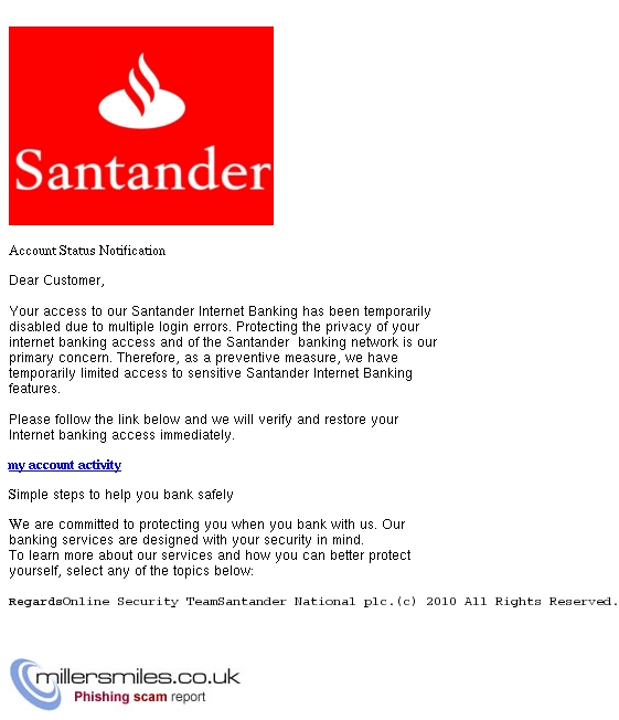 • Email asks you to confirm/update/verify your account data at SANTANDER BANK by visiting the given link. You will be taken to a spoof website where your details will be captured for the phishers.
